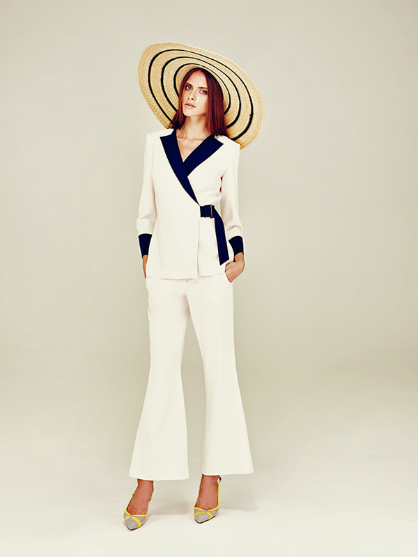 Брючный костюм не носит привычный мужской стиль. Здесь используется крой японских жакетов, а крой брюк позаимствован из 70-х.