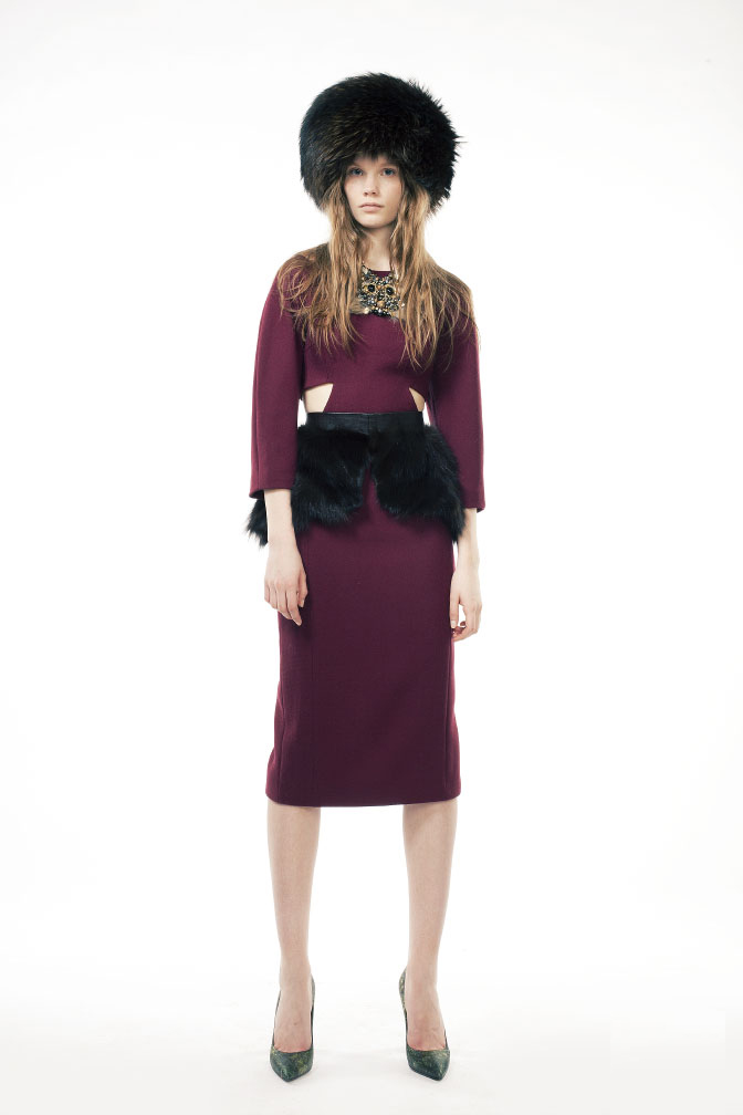 Женственное и строгое бордовое платье отделано меховой баской, которая перекликается с мехом головного убора. А вырезы по бокам платья делают образ эпатажным.