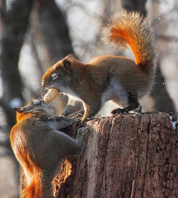 Белки дерутся за орех по всем правилам боевых искусств. Фото