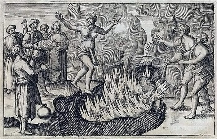 Вплоть до XIX века в некоторых штатах Индии был распространен обряд «сати»: когда умирал мужчина, его кремировали и в этом же костре заживо сжигали его вдову. Известны случаи, когда женщины прыгали в костёр сами или разжигали огонь, сидя в костре. Но всё же чаще им «помогали» добрые родственники, которые, стоя вокруг костра, держали в руках шесты, которыми загоняли женщину, пытавшуюся в ужасе убежать от пламени, обратно в огонь. Официально сати был запрещен только в 1987 году. Но, несмотря на запрет, ежегодно в Индии совершается по нескольку десятков обрядов. Если вдова настаивает на самосожжении, то она обязана подписать соответствующий документ, подтверждающий добровольность акта. Конечно, можно решить, что живучесть обряда — свидетельство силы индийских традиций, но жизнь показывает, что огонь для индианок является единственным избавлением от вдовьего существования. Считается, что смертью мужа боги наказывают женщину за грехи. Соответственно, именно она виновата в его смерти, за что должна расплачиваться всю оставшуюся жизнь.
