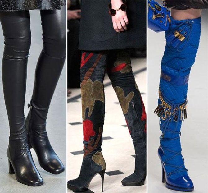 Самый жаркий тренд – очень высокие обтягивающие сапоги. Причем некоторые модные Дома представили очень смелые варианты, когда длина сапог доходила до самых бёдер. Правда такой вариант подойдёт не всем. На очень полных ногах облегающие сапоги будут выглядеть нелепо, а длина выше колена будет хорошо смотреться только на высоких девушках.