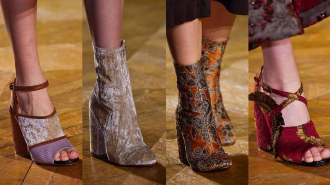 В этом модном сезоне можно наблюдать огромное богатство материалов, фактур и декора. Все они достаточно смелые, яркие и эффектные. Лакированные сапожки из 90-х, придают образу сексуальности. Бархатные ботинки из 70-х помогут создать элегантный образ. А имитация змеиной кожи (отголосок 2000-х), сделают свою обладательницу более уверенной в себе.
