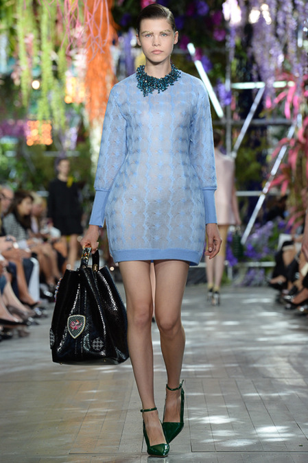 Платья с манжетами обычно бывают вязанными, Раф предложил более интересный вариант с объемным фасоном.