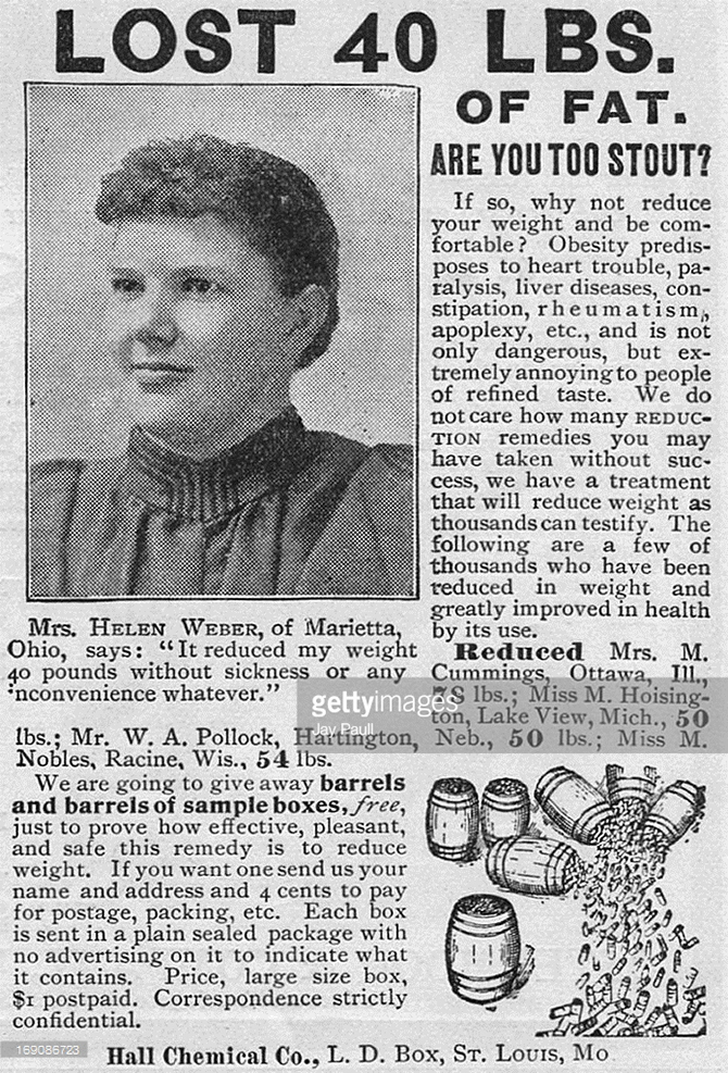 Реклама препарата для похудения Hall, Сент-Луис, Миссури, 1899. На снимке — миссис Хелен Вебер из Мариетты, штат Огайо.