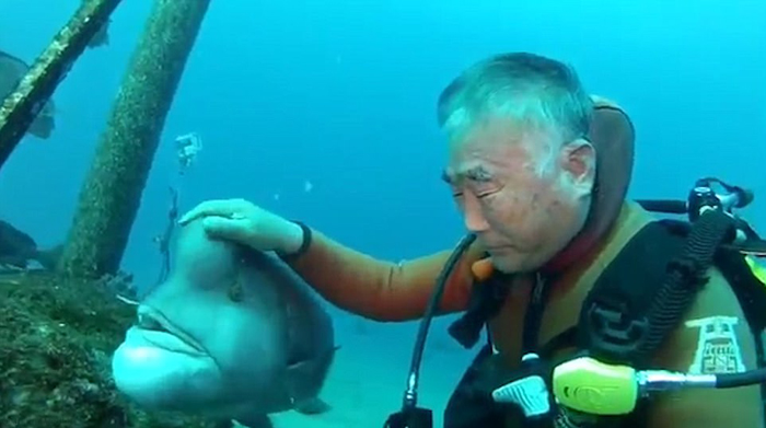 Дайвер дружит со спасенной 25 лет назад морской рыбой. Фото