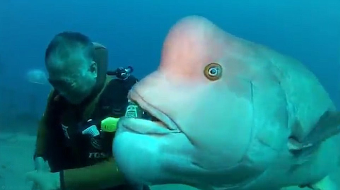 Дайвер дружит со спасенной 25 лет назад морской рыбой. Фото