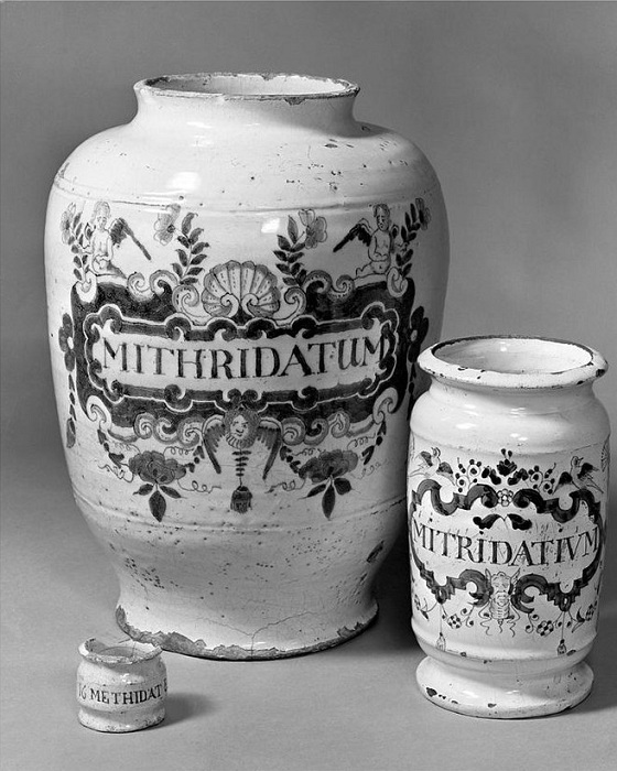 В древние времена митридатий считался абсолютным противоядием. Своим появлением он обязан понтийскому царю Митридату IV. Правитель считал, что родная мать ежедневно отравляет его малыми дозами яда. Тогда он изобрел зелье, состоящее из 65 ингредиентов. Благодаря антидоту, Митридату IV удавалось не раз избегать смерти. В Средние века митридатий считали панацеей от чумы.