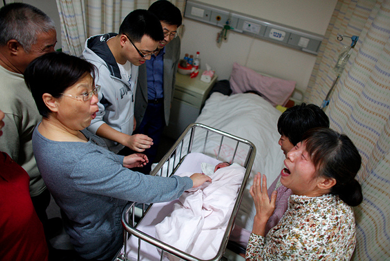 Бабушки Ванг Хуи Цио и Гуо Хуа Ли радуются своему новорожденному внуку в больнице Шанхая. Родители малыша Янг Хойцин и ее муж Чэнь Имин оба родились во время действия политики «одного ребенка». Это их первый и единственный ребенок. (Carlos Barria / Reuters)