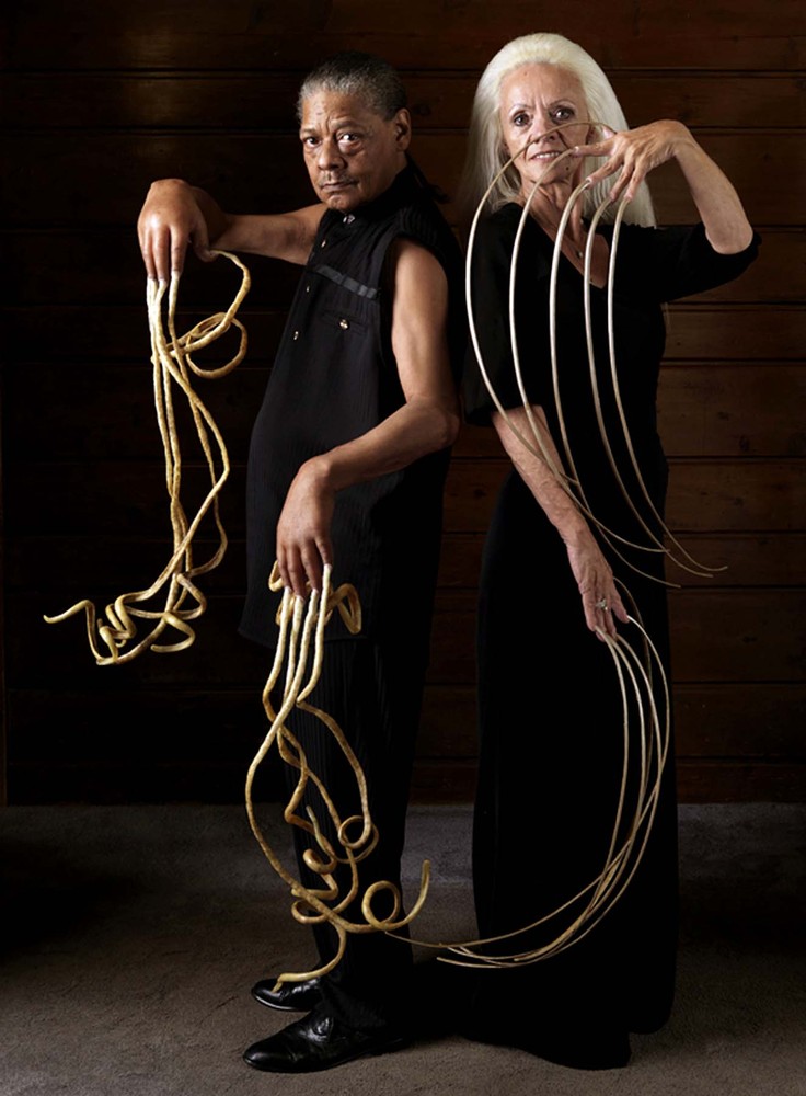 Ли Редмонд (справа), бывшая рекордсменка с титулом «Самые длинные ногти», и Мелвин Бут – нынешний владелец титула. Его ногти равны 9 м. Ли Редмонд потеряла свои ногти в автомобильной аварии в 2010 году. (Photo by Ronald Mackechnie/Guiness World Records Book Launch/Associated Press)