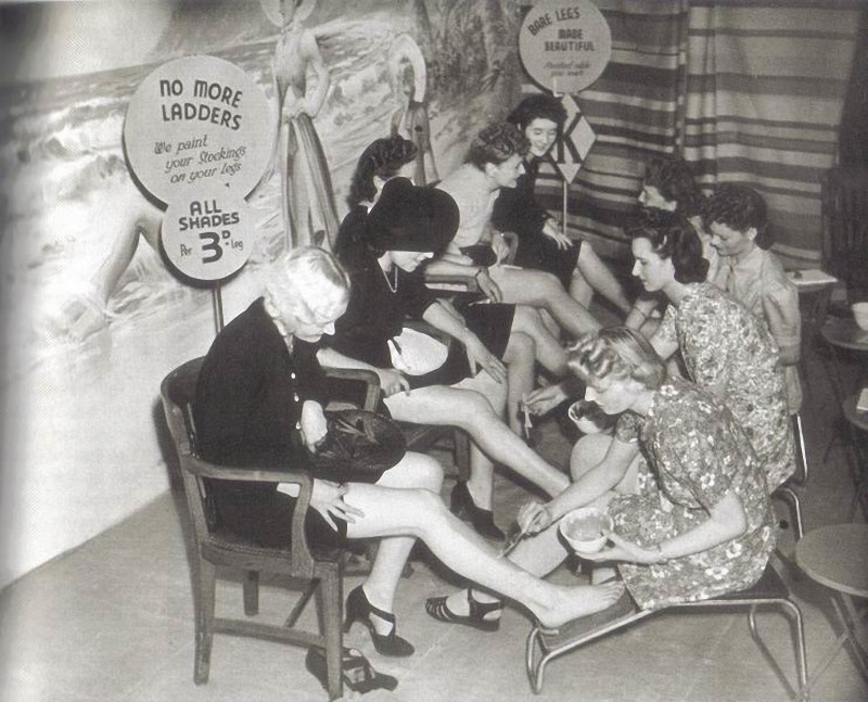 Однако, желание женщин следовать моде и выглядеть эффектно оказалось сильнее тяжелых событий тех лет, таким образом, был найден выход – чулки можно… рисовать! Если вдруг на праздничный ужин в 41м к коктейльному платью крайне необходима была пара чулок, то их делали с помощью лака, а темный карандаш вырисовывал знаменитый «шов сзади». Лак для этих целей, соответственно, производился в промышленных масштабах.