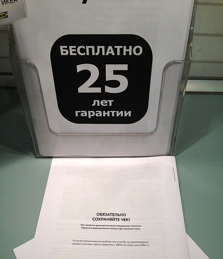 25 лет гарантии. Круто, правда? Есть одна проблема. Надо сохранять чек. Проверка, опять же, на знание физики. Чек у них печатается на обычной кассовой термоленте (я проверил на месте). У меня в офисе лежит много чеков. Мы их ксерокопируем, потому что через год-два они полностью выцветают. Самый старый чек, который видел коллега, держался 3 года в папке в архиве. Так сколько лет гарантии?