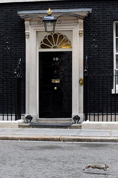 Белочка бежит по своим делам мимо резиденции премьер-министра Великобритании на Даунинг-Стрит.
