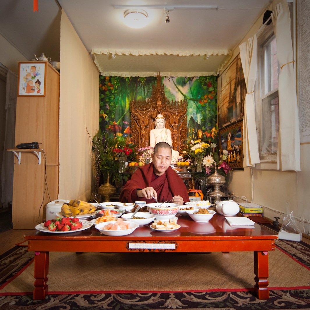 У Па Мок Кха — монах из Мьянмы, который не может есть после полудня. Местные приносят ему еду, и когда он закончит, он делится тем, что осталось, с ними. Возраст: 55 лет. Время ужина: 11:17. Место: Джексон Хайтс, Квинс. (Miho Aikawa)