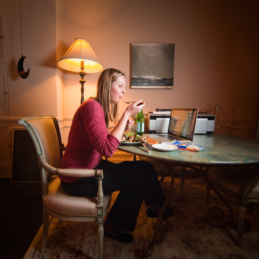 Эмили Ролин Жакеминс — студентка из Бельгии — ест салат дома после вечерних занятий. Возраст: 27 лет. Время ужина: 21:46. Место: Аппер-Ист-Сайд, Манхэттен. (Miho Aikawa)