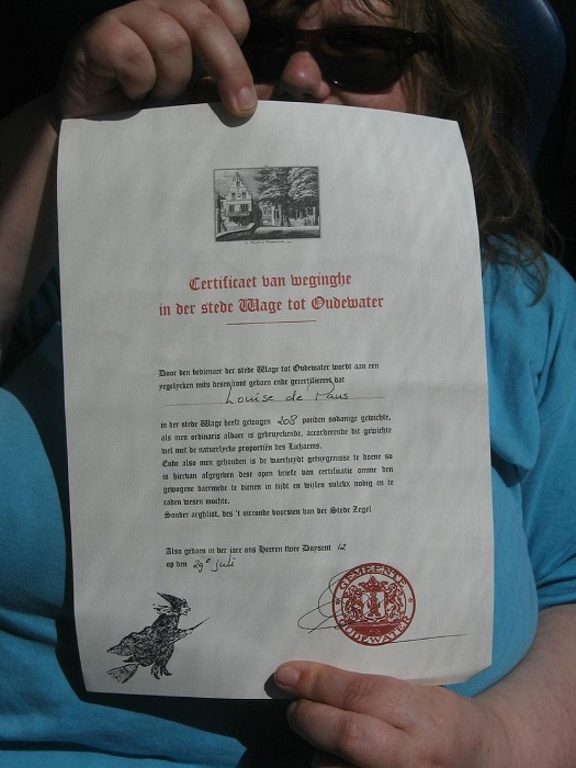 Сегодняшним туристам, посещающим дом-музей Heksenwaag, рассказывают более романтичную версию возникновения сертификатов. Согласно легенде, в середине XVI века в Аудерватере останавливался римский император Карл V. Вместе с ним привезли девушку, которую взвешивали в другом городе и обвинили в колдовстве. Heksenwaag не подвели и показали правильный вес несчастной. В благодарность Карл V даровал Аудерватеру право выдавать Сертификаты невиновности. Письменных подтверждений подобной версии не найдено, но Карл V вполне мог останавливаться в Аудерватере, т. к. в XVI веке это был крупный торговый центр, гораздо более развитый, нежели Амстердам.
