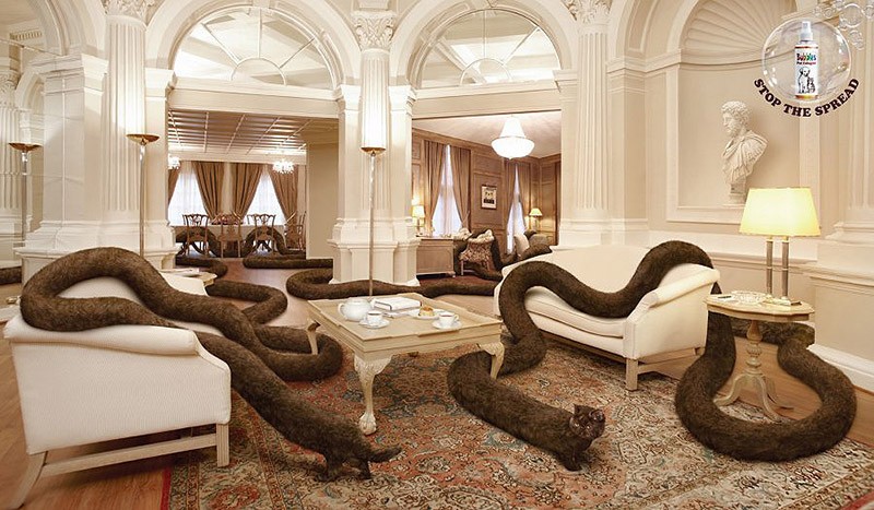 В Индонезии коты пахнут так же, как и во всём остальном мире. Этот постер — реклама «кошачьего одеколона» компании Bubbles.