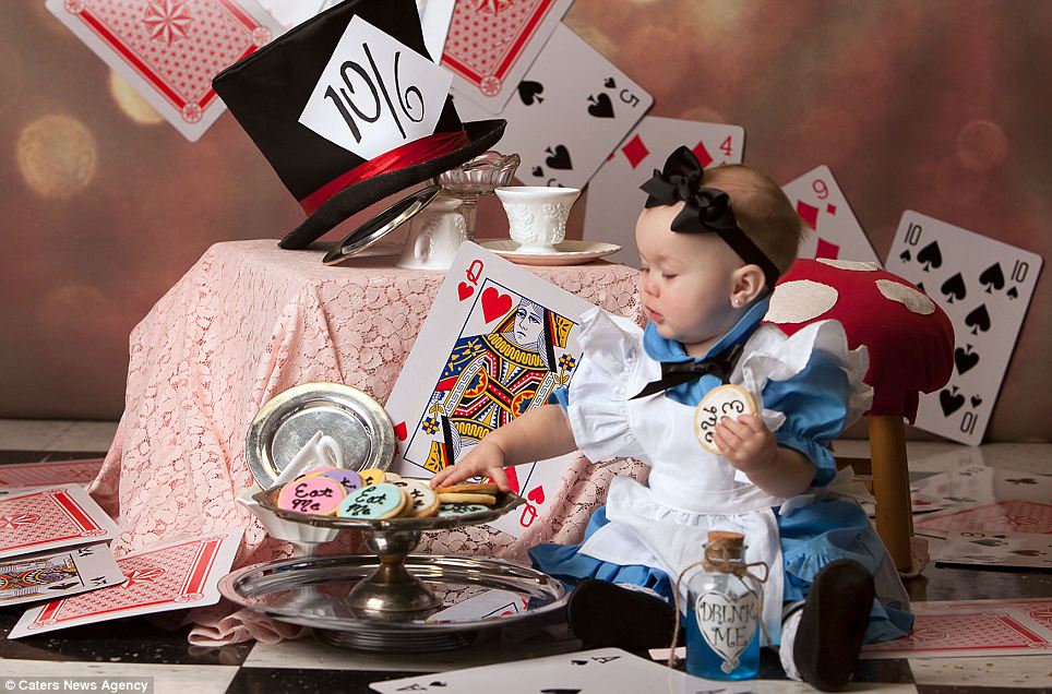 Николь хотела сфотографировать своего четвертого ребенка – малышку Мэдди – по-особенному. А так как сама Мэдди и вся ее семья очень любят сказки, вопрос с тематикой решился сам собой. Николь с азартом выбирала все костюмы и бутафорию, чтобы снимки получились идеальными. На момент съемок Мэдди было от 6 до 9 месяцев. На фото: Мэдди в роли маленькой Алисы в Стране Чудес.
