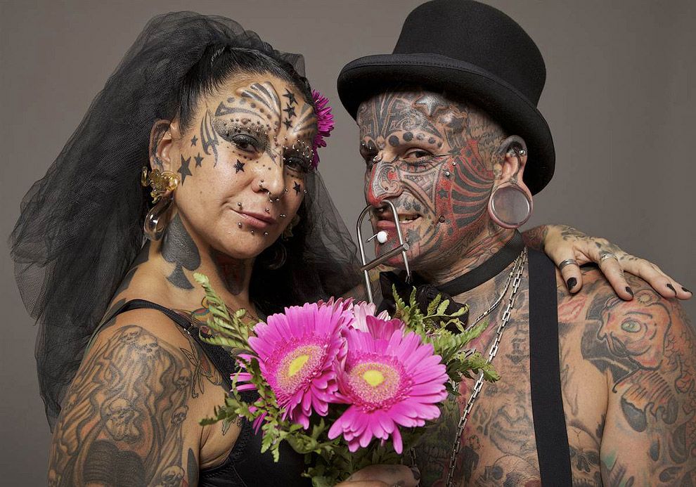 Виктор Хьюго Перальта из Уругвая и его жена Габриэла Перальта из Аргентины могут похвастаться 77 модификациями тел, в том числе 50 пирсингов, 11 нательных имплантатов, 5 зубных имплантатов, 4 расширителя ушей, 2 болта в ушах.