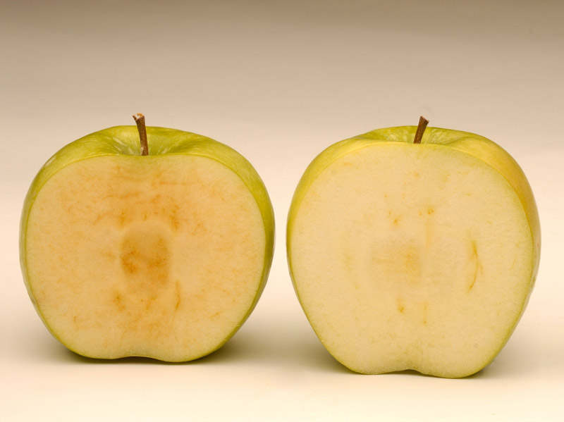 Пока что данная разработка выглядит наименее необходимой и также ждет утверждения Управления по сантираному надзору. Компания Okanagan Specialty Fruits представила генетическую добавку, позволяющую яблокам не темнеть вне зависимости от того, насколько давно оно было разрезано. В Яблочной ассоциации США пока не знают, как к этому относиться. «Может такие яблоки и не составляют угроз здоровью, но вопрос в том, как покупатель воспримет это новшество. Как изменится его отношение к яблокам в целом? Настолько ли это необходимо?» — комментирует Вэнди Браннен.