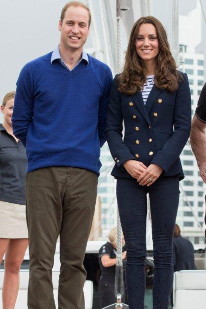 На следующий день герцог и герцогиня Кембриджские продемонстрировали спортивные навыки в Окленде, соревнуясь в гонках на одномачтовых яхтах. К спортивному клубу Кейт прибыла в полосатом топе ME+EM, темно-синем пиджаке Zara, скинни-джинсах J Brand и обуви на танкетке Russell & Bromley.
