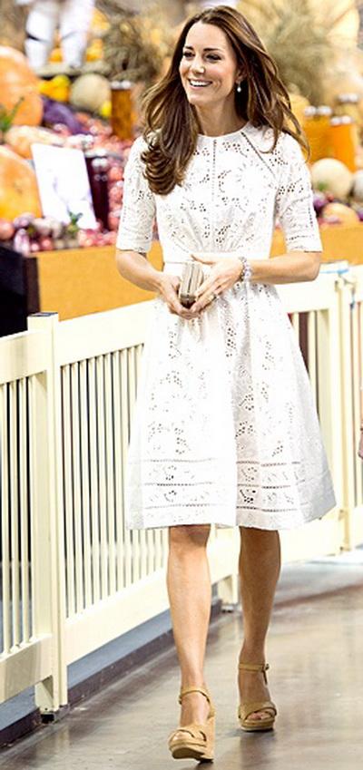Одним из самых элегантных нарядов Кейт стало белое перфорированное приталенное платье Zimmermann, которое она надела на пасхальную ярмарку и смотр соревнований серферов. Образ герцогиня дополнила босоножками на танкетке любимого бренда Stuart Weitzman и бежевым клатчем L.K. Bennett.