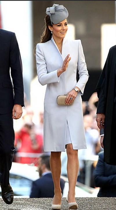 Для пасхальной службы Кейт выбрала серо-голубое пальто Alexander McQueen и платье в тон. Она дополнила образ шляпкой Jane Taylor, замшевыми туфлями L.K. Bennett и клатчем Alexander McQueen.