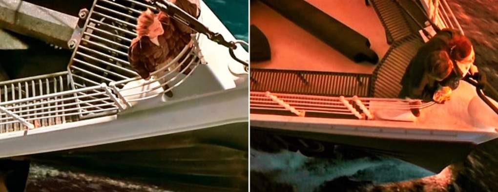 Это сложный случай, но поскольку многие смотрят «Титаник» не один раз, киноляп все же можно заметить. В начале Джек и Фабрицио стоят на носу лайнера, и хорошо видно, что палуба под огромным якорем – черная, а мостки довольно широкие. А вот для знаменитой сцены объятий Джека и Розы были использованы другие декорации.