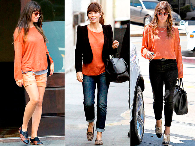 Джессика Билл сочетает оранжевый свитер с разными брюками