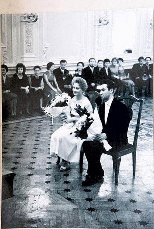 1 ноября 1959 года ровно в 12 часов дня перед Калашниковыми Вадимом Иосифовичем и Людмилой Васильевной под звуки марша Мендельсона распахнулись двери торжественного зала Дворца бракосочетаний. Все было скромно – платье без кринолина, колечко одно на двоих и по-комсомольски сдержанный поцелуй. Но можно представить, какими счастливыми чувствовали себя молодожёны! Ленинградский дворец бракосочетания или “Дворец счастливых” до 1917 года был особняком великого князя Андрея Владимировича Романова. После Великой Отечественной войны в здании располагалось проектное бюро. А к открытию Дворца здание оформили в подобающем, “советском”, стиле: на столе, покрытом красной скатертью стоял бюст Ленина, на стенах висели портреты членов политбюро. Над всем этим возвышалась кафедра, так же выкрашенная в красный цвет с гербом Советского Союза. 1963 год. По словам некоторых свидетелей свадеб того времени, посещение ленинградского Дворца с непосредственном «участием» в церемонии даже входило в программу пребывания финских туристов в северной столице. Само собой, в первый в стране Дворец мечтали попасть многие женихи с невестами.