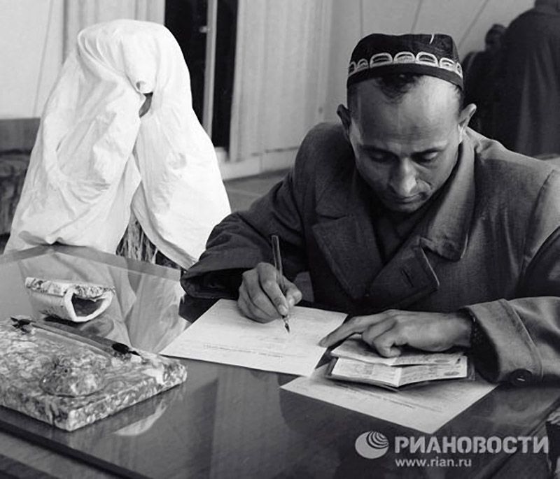 Говоря о традиции непосредственно церемонии бракосочетания, стоит отметить, что не смотря на повальную «стандартизацию», в республиках бывшего Советского Союза сохранялись свои народные и религиозные обычаи: в Таджикистане даже спустя 40 лет после победы советской власти никто не мог видеть лица невесты.