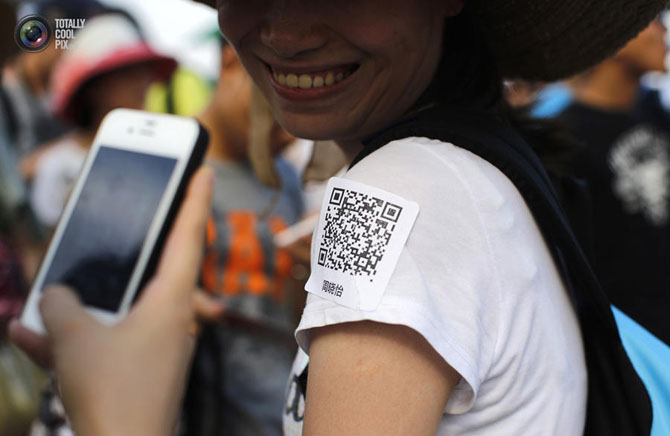 Молодой человек фотографирует QR-код, приклеенный на футболку женщины. Этот код, используется для обмена личной информации, во время встреч одиноких людей.