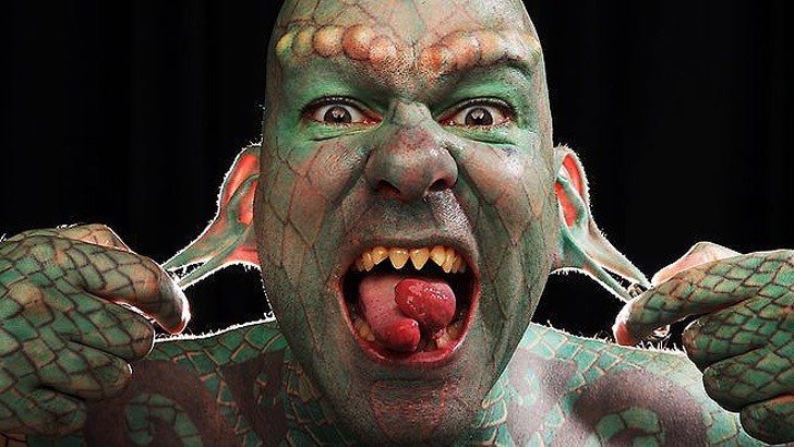 Если бы вам пришлось выбирать, на какое животное вы будете похожи, кого бы вы выбрали? Эрик Спрэг, безусловно, задал себе этот вопрос — и он знал ответ. Человек из Остина, штат Техас, разделил свой язык на две части и был одним из первых, кто это сделал, а затем провел в общей сложности 700 часов в тату-салоне. Его зубы заточены как клыки, губы покрашены в зеленый, а ноздри и мочки ушей растянуты. По профессии Спрэг — современный перформанс-исполнитель, среди его номеров — глотание огня и сабель.