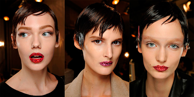 Наши читательницы заинтересовались не только нарядами с Недели Высокой моды в Париже, но и прически, и макияж. А здесь на подиумах царит разнообразие. У Christian Dior весь акцент на губах. Помимо яркой помады они украшены еще и стразами. Еще один немаловажный акцент — брови. Они не выделены темным цветом, зато форма — обязательно широкая сообщает *Настроение* по материалам сайта *StarLook*