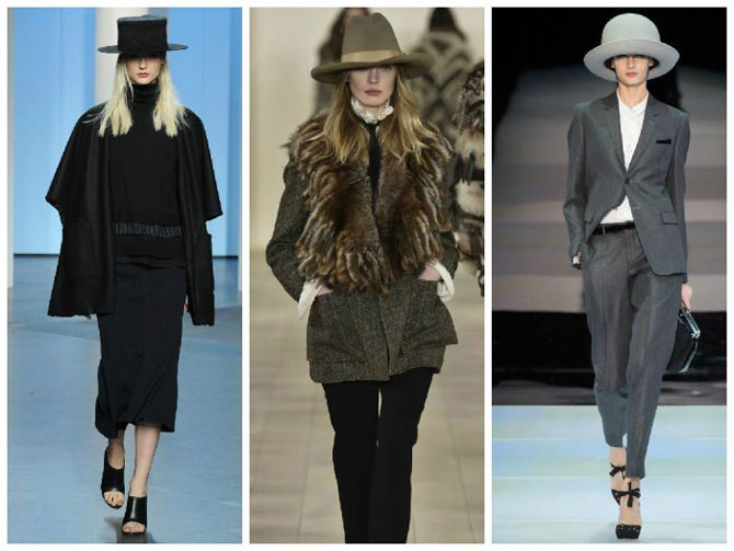 В этом году модно носить и шляпы. Наиболее актуальными считаются уборы из фетра со средними полями. В тренде классический английский дизайн и шляпы в стиле кантри. В цветах дизайнеры ограничиваться не стали и разрешили модницам носить изделия серого, чёрного, зелёного, кремового и винного оттенков. Главное, шляпа должна немного прикрывать линию глаз, тем самым делая образ загадочным.