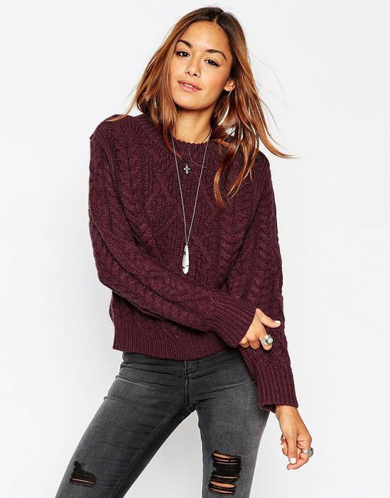 Огромной популярностью этой зимой пользуются свитера с крупными вязаными узорами. Они выглядят очень эффектно, сочетаются с совершенно разными предметами одежды, например, с прямой классической юбкой или расклешёнными штанами в стиле хиппи, обтягивающими леггинсами или прямыми брюками.
