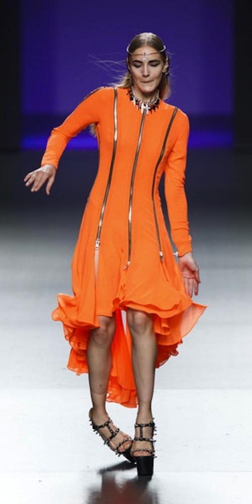 Модель пытается удержать равновесие на показе коллекции от Марии Эскот на Нью-йоркской неделе моды. (AP / Daniel Ochoa de Olza)