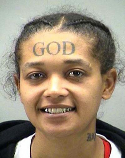 В последнее время у американских зэков появилась новая мода — наколки в центре лба. Несколько примеров тюремного «фольклора» привела на днях газета Telegraph. Мания Величко, она же 33-летняя Джейми Кэллоуэй, с татуировкой «Бог», была арестована в округе Монтгомери, штат Мэриленд. Обвиняется в том, что будучи офицером в исправительной колонии, склоняла заключенных к однополой любви.