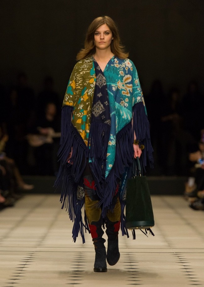 Burberry Prorsum представили осенне-зимнюю коллекцию 2015. Кристофер Бэйли (Christopher Bailey) вдохновлялся 70-ми: яркие цвета, пончо, богемные цветочные принты, сообщает *Настроение* по материалам сайта *Etoday*