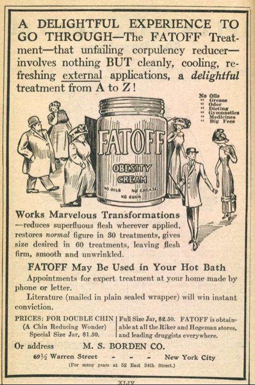 «Чудодейственное средство для похудения – чистый, холодящий и освежающий крем для наружного применения. Без жира и масла, без запаха, не требует соблюдения диеты и физических нагрузок, доступен по цене. Восстанавливает нормальную фигуру за 30 сеансов применения, создает точеный силуэт за 60. Подходит для использования в бане». Точный состав этого средства не дошел до наших дней, но можно со 100%-ной уверенностью сказать, что оно было абсолютно бесполезно в борьбе с ожирением. Продажи таких снадобий никак не регулировались законом, и производители даже не удосуживались написать перечень ингредиентов на упаковке.