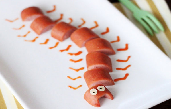 Впрочем, не яичницей единой жив человек! Вспомним о распространённом компаньоне данного блюда — сосиске. Казалось бы, что с ней-то можно придумать? Отварил, пожарил — вот и вся наука. Ан, нет! Тут важно правильно её порезать, а точнее — проявить фантазию при распределении кусочков на тарелке. Если выложить кусочки волной на небольшом расстоянии друг от друга и дорисовать к ним «кетчупные» конечности, то получится монстр-сороконожка. Выразительность «морде» добавляется майонезными глазами и маслинными зрачками.