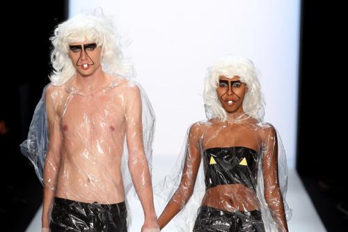 На другом показе в том же 2010 году Патрик Мор проявил не только креативной подход к созданию образов, но и выразил толику заботы о своих девушках и парнях-моделях. Проявилась она в уютных дождевиках, которые при внезапной непогоде не позволят промокнуть молодым бобрам.