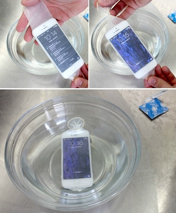 Из презерватива можно легко сделать водонепроницаемый чехол для смартфонов и других электронных устройств, просто натянув его на девайс, а затем туго завязав. Что интересно, смартфон с емкостным сенсорным экраном можно использовать в презервативе даже под водой.