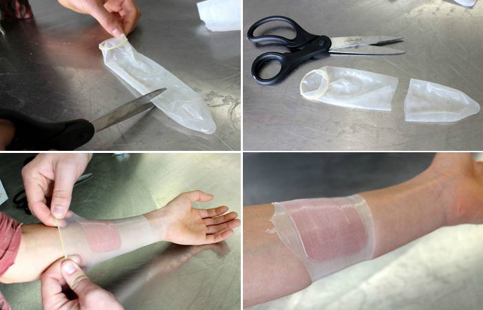 Как известно, раны необходимо держать сухими. Что же делать, если на руке или ноге повязка, а нужно пойти в душ? И тут поможет презерватив. Его необходимо развернуть, обрезать кончик, натянуть на руку или ногу так, чтобы он плотно охватил сверху повязку. Учитывая, что презерватив водонепроницаемый и будет очень плотно охватывать конечность, повязка останется сухой.