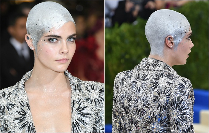 Странная «прическа» актрисы состоит из серебристой краски и кристаллов Swarovski.