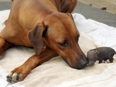 Крошечный черный поросенок по кличке Паулинхен, живущий на одной из немецких ферм, был таким маленьким при рождении, что его мать просто не замечала его. Новой мамой вислобрюхому поросенку стала 8-летняя собака Катинья, которая полюбила его, как своего щенка.