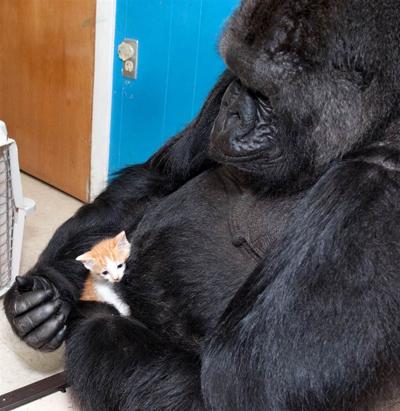 Для гориллы Коко выращивать котят не в новинку — она делает это с 1984 года. Доброволец организации по защите горилл Янис Тернер периодически приносит в центр осиротевших котят. На фото — Коко со своим любимцем, рыжим котенком по имени Тигр.