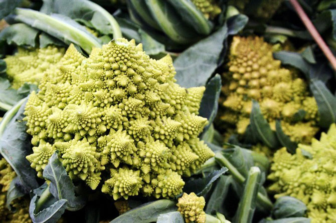 Если кто-то считает капусту скучным жанром, ему обязательно надо познакомиться с производной от брокколи и цветной капусты. Выведенный десятилетия назад в Италии сорт романеско особенно хорош по двум причинам. Во-первых, в нем много полезных веществ, как в обычной капусте — каротин, минеральные соли, витамин С и цинк, но клетчатки меньше — поэтому продукт гораздо лучше усваивается. А во-вторых, романеско абсолютно лишен характерного капустного запаха. Про него есть и забавный факт: существует сложное понятие «фрактал» — математическое множество, обладающее свойством самоподобия, плюс еще множество непонятных слов. Так вот, романеско является графическим воплощением фрактала, качаном его обычно и иллюстрируют.