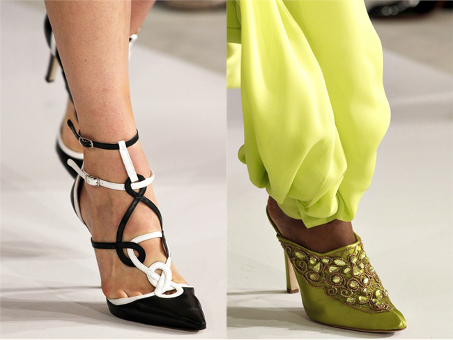 На подиуме были продемонстрированы прямо-таки экстремальные варианты носов – очень длинные и очень острые. Но для жизни все же больше подойдет классика. Слишком длинные носы – это как минимум не практично, да и мало какой ноге они подойдут. Выбирайте оптимальную длину носа и небольшую закругленность. Сама модель туфель или босоножек должна быть лаконичной. Не забывайте, что остроносая обувь зрительно вытягивает ногу, особенно сильно это заметно, если обувь без каблука. Поэтому если ваш размер ноги больше 39-го, острый нос не для вас, или выбирайте хотя бы не слишком длинный и желательно, чтобы нос туфель был темнее их основы.