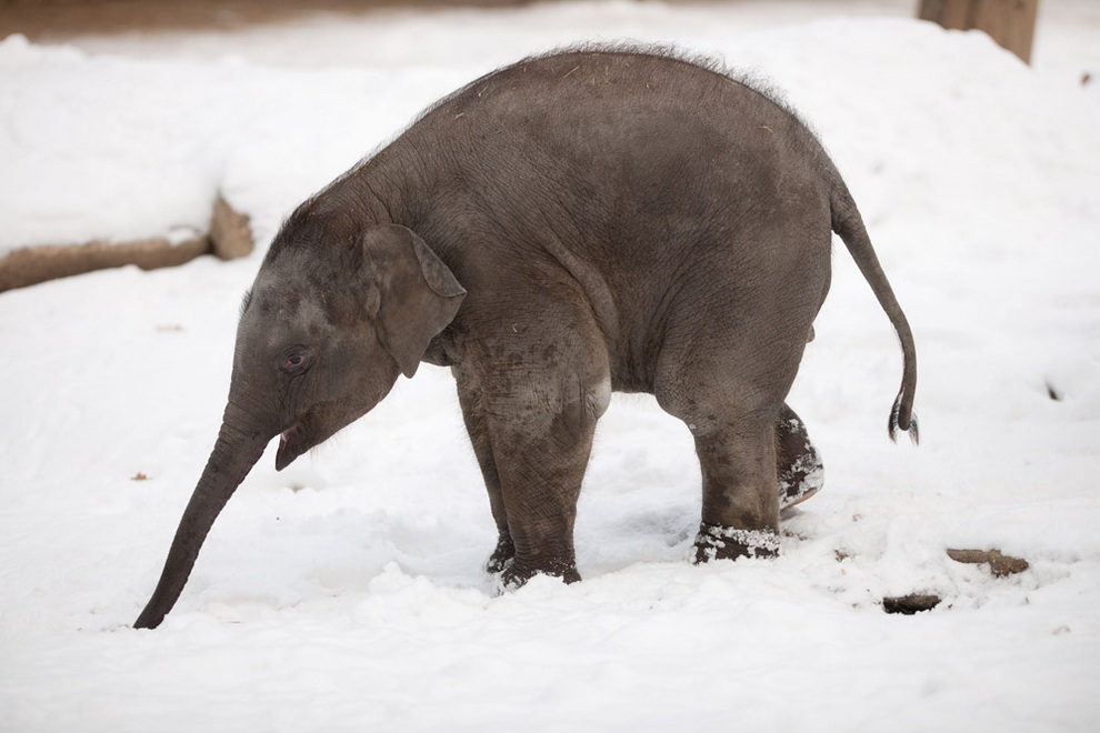 Очаровательный слоненок из Берлина первый раз в жизни увидел снег. Фото