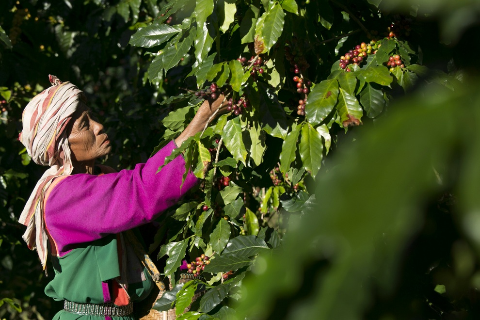 Женщина народности лису собирает зрелые ягоды арабики на плантации в Пхрао, провинция Чианграй, Таиланд. (Paula Bronstein/Getty Images)